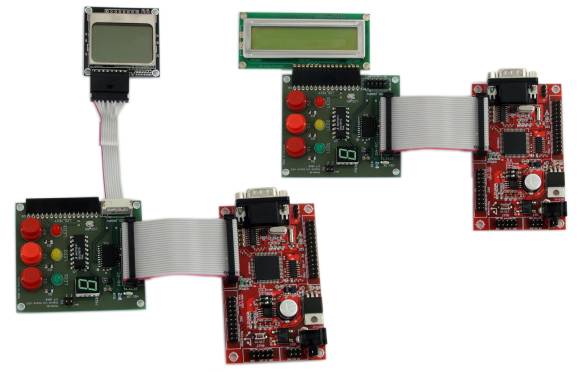 Das LCD Modul ist eine Kombination von Anschlüssen des digitalen I/O Moduls und zwei verschiedenen LCDs. Das digitale I/O Modul hat zwei verschiedene Spannungslevelanschlüsse für die LCDs. Alphanumerische LCDs arbeiten mit 5 V Spannung und graphische LCDs mit 3.3 V. Das Back-Light des alphanumerischen LCD kann mit einem kleinen Potentiometer (LCD_BG) am digitalen I/O Board reguliert werden und das graphische LCD Back-Light kann über Software kontrolliert werden. Beide LCDs können am Port PA angeschlossen werden, jedoch nicht beide gleichzeitig.