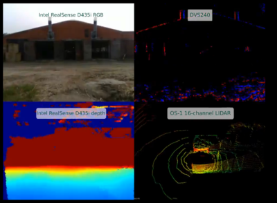 Image is taken from an experimental agriculture robot that uses multiple time-synchronized sensors – Single RGB camera (upper-left), Event-based camera (upper-right – reds pixels with increasing intensity, blue ones with decreasing), Lidar (lower-left), and stereo vision camera (lower-left). Image and video produced in ERDF 1.1.1.2 “Post-doctoral Research Aid”, project num. FLPP Lzp-2018/1-0482.
