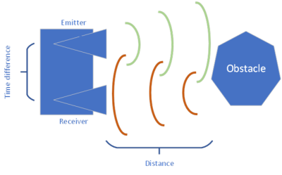 This group of sensors uses ultrasound waves and their feature of reflection from objects/obstacles. Knowing the sound wave propagation time, it is possible to calculate the distance to the first obstacle on the wave’s route. To do it, it is necessary to measure the time between emission and receiving time moments of the sound impulse. Therefore, the senor in its essence is a do-called time of flight sensors or simply ToF.