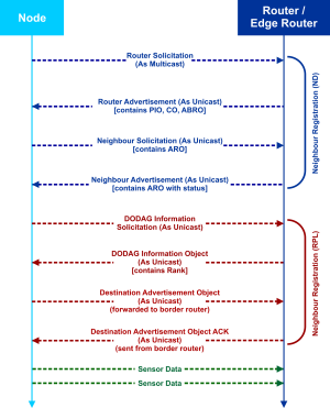 Typical IPv6 networking discovery won't work here because multicast/broadcast messages are not passable through 6LoWPAN routing nodes (routes as on in Figure 380.