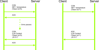 Request-reponse pair is identified by a unique “Token”. Sample request-response scenarios are presented in images below. Sample CoAP message exchange scenarios between client and server are presented (two per image) in Figure 382 and Figure 383.