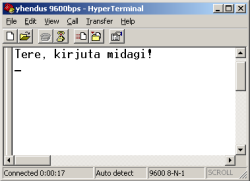 With Windows XP OS comes a program called HyperTerminal. It is opened from the Start menu by selecting Accessories CommunicationsHyperTerminal. Select 9600 bps, 1 start-bit and 1 stop-bit without parity- and stream-control for configuration. When the HyperTerminal is opened during the time when the microcontroller is starting, there will be a welcoming message on the display. The letters inserted through the window are displayed in the alphanumerical LCD. By pressing Enter button the row is changed on the LCD.