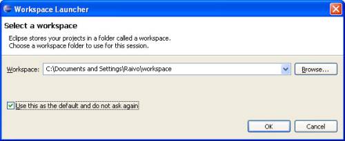 1. Start Eclipse (Robotic HomeLab IDE) and ja setup new project. If the software is newly installed, project repository Workspace must be created. To do this, select the Workspace folder location in main window where the repository will be created.