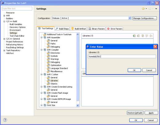 7. For using HomeLab library, it is assumed to be correctly installed into operation system with the help of instruction. For every project the library must be included into list of linkable objects in project options. To do this, open at first: Project → Properties and then from leftside tree C/C++ Build → Settings, further Tool Settings → AVR C linker → Libraries. Choose in window that opened in the right under Libraries (-l) icon Add… and input to the dialog box “homelab2561”. Then OK and one more OK.