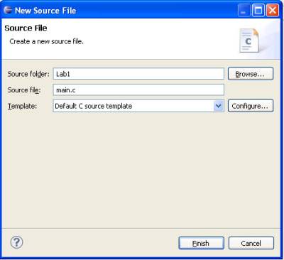 4. After this the user interface for program development will open. Before you can start writing code, new file for source code is needed to create. To do this, click mouse right button on your fresh project, select New - Source File and input a name to it, which must be ended with “.c”. It is recommended to name the main file as “main.c”. After pressing Finish button, a new file is created and opened in development environment.