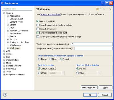 5. Before you start writing the source code, it is advisable to make some changes in preferences for easier use of development environment. Choose from menu Window - Preferences and navigate from leftside tree to General - Workspace and select option Save automatically before build
