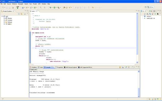 For successful compilation, the code is needed to be error free and the compilator must be able to find all necessary header files. A successful compilation is indicated in Problem window as emptiness (or at outermost cases some warnings Warning) and in Console window as the output of compilator which will for example be in this case: