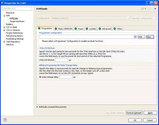 2. Set options for program loader (AVRDude). For this again open project properties Project → Properties and from leftside tree AVR → AVRDude, further Programmer configuration → New. The dialog box that now opens needs no changes and you can press OK button. If it is selected press Apply and then OK.