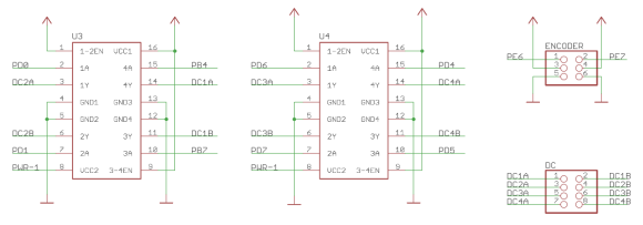 DC motors are connected to the connector group DC. Every pair can handle one motor - all together 4 DC motors. Motors are controlled with widely used H-bridges, L293D dual H-bridge driver is used for the DC motors. Motors can also be replaced by some other actuator which can be controlled digitally and if the current do not exceed 500 mA (piezo generator, relay etc.)