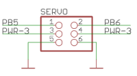 RC servo motors are connected to the connector Servo on the Motor board. Motors are connected so that the ground wire (usually black or brown) is on the pin GND (close to the edge of the board). Two servo motors can be used at the same time. The control signals are connected directly with microcontroller timer outputs.