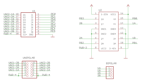 Motor board supports two different types of stepper motors. Two unipolar and one bipolar motor can be connected with the board. Bipolar stepper is controlled with dual H-bridge L293D and unipolar stepper is driven by transistor array ULN2803. The patterns of the stepper signals are generated by the software. It is important to check the sequence of the stepper motor windings. The supply wires of unipolar stepper motor are connected to pins Vcc. If unipolar stepper has only 5 wires, the first pin is left unconnected.