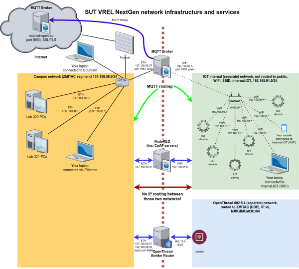 If you're a fully remote student, you do not have access to the public part of the network (addresses 157.158.56.0/24); thus, you need to use only IoT devices and services available in the internal IoT WiFi network that IoT devices you're programming can access. You may still access MQTT messaging via the 2nd MQTT Broker bridged, but it requires specific topic organisation as not all topics are forwarded. Refer to the documentation below.
