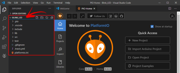 After that, the PlatformIO icon should appear on the left sidebar and a Home icon redirects you to PlatformIO home. If not, restart Visual Studio Code.