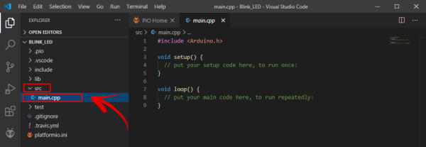 The src folder is your working folder. Under the src folder, there’s a main.cpp file. That’s where you write your code. Click on that file. The structure of an Arduino program should open with the setup() and loop() functions.