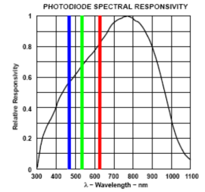 A photoresistor is a sensor which electrical resistance is altered depending on the light intensity falling on it. The more intense is the light the more free carriers are formed and therefore the lower gets the resistance of the element. Two exterior metal contacts of the photoresistor are reaching through the ceramic base material to the light sensitive membrane, which determines the electrical resistance properties with its geometry and material properties. Since photo sensitive material itself has high resistance, with narrow, curvy track between the electrodes, low total resistance at average light intensity is gained. Similarly to the human eye, the photoresistor is sensitive at certain range of wavelengths and needs to be considered when selecting a photo element, otherwise it may not react to the light source used in the application. Following is simplified list of wavelengths of visible light segmented by colours: