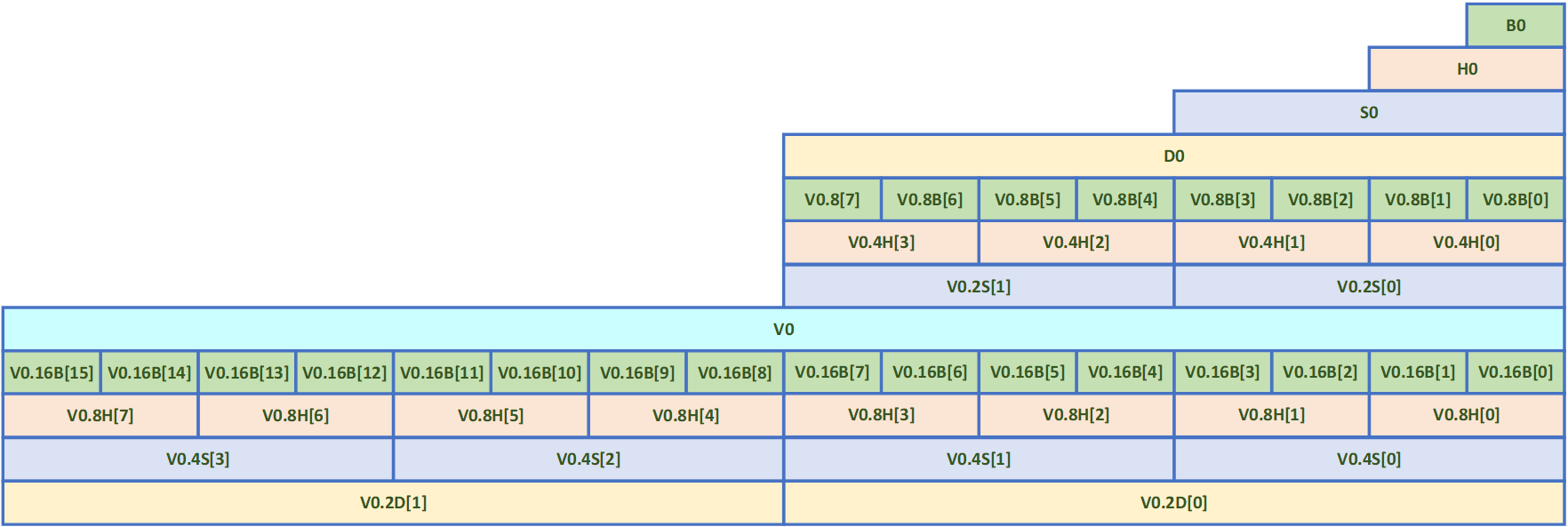 • V0.2D can hold two elements: two double-precision floating-point variables or two 64-bit integers, where the letter d indicates doubleword