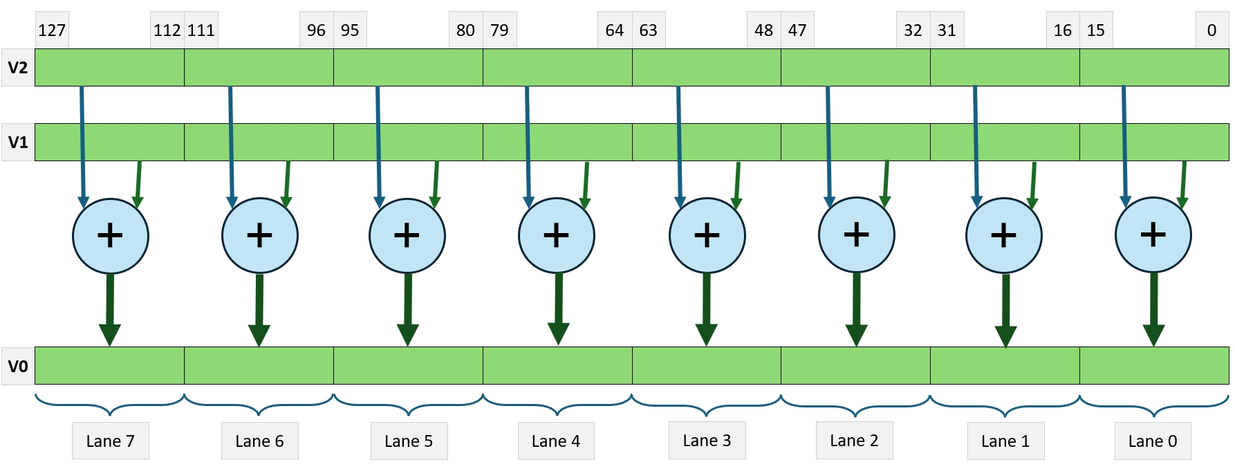 In the image, it is also visible how the elements are added together in separate lanes (eight lanes). The lanes used for operations depend on the vector register elements used in the operation. Another example with only four lanes involved would be from this instruction: ADD V0.4S, V1.4S, V2.4S