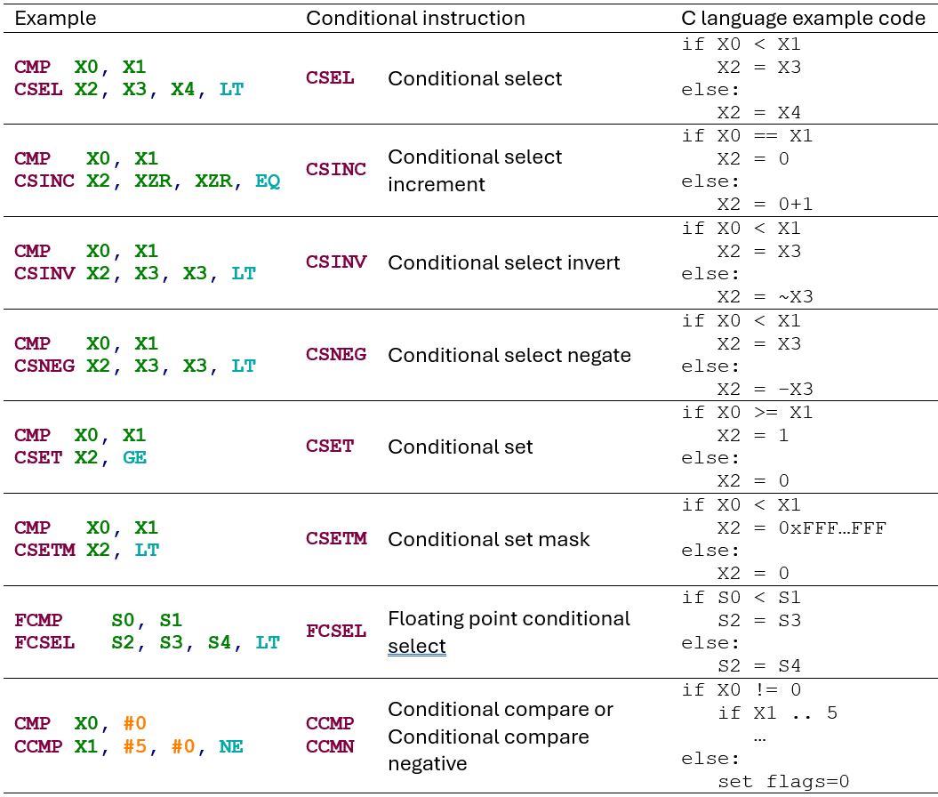 This conditional instruction writes the value of the first source register to the destination register if the condition is TRUE. If the condition is FALSE, it writes the value of the second source register to the destination register. So, if the X0 value is less than the value in the X1 register, the CSEL instruction will write the X3 register value into the X2 register; otherwise, the X4 register value will be written into the X2 register.