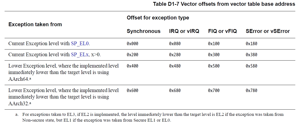 In total, 16 exception handlers must be defined (four exception levels multiplied by four execution states). A special structure that holds addresses of all exception handlers is called the exception vector table, or just the vector table. The AArch64 Reference Manual has information about the vector table structure. Each exception vector has its own offset: