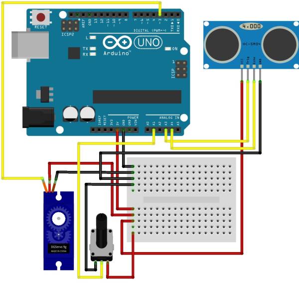 Selles projektis tuleb ühendada Arduino plaadiga potentsiomeeter ja servomootor ning teises näites lisaks ultraheli kaugusandur. Kõigi seadmete ühendamiseks Arduino Uno plaadiga läheb vaja, kas makettplaati või sobivaid kaableid, mis jagavad toitepinget. Kui kasutada näiteks Iteaduino Uno plaati, siis eraldi kaableid pole vaja, kuna selle plaadi kõik viigud on dubleeritud ja omavad eraldi toitepistikuid. Ultrahelianduri paigutamisel servo hoovale võib kasutada spetsiaalset ultrahelianduri hoidikut või ajutise lahendusena ka kahepoolset teipi.