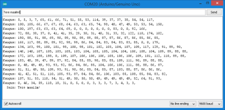 void loop() { char saabunudAndmed; //Kontrollime jooksvalt saabunud baitide arvu if (Serial.available() > 0){ delay(50); //Väike viide, et kõik baidid jõuaks kohale Serial.print("\n Sain: "); //Teavitame saabunud andmetest saates need tagasi jadapordi monitori while(Serial.available() > 0){ saabunudAndmed = Serial.read(); //Loeme puhvermälust baidi muutujasse Serial.print(saabunudAndmed); //Saadame baidi tagasi jadaporti } } }