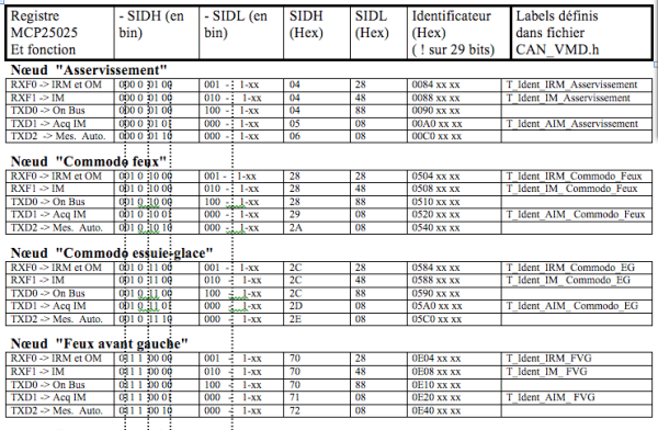 Tableau des identificateurs pour nœuds CAN (Véhicule Multiplexé Didactique)