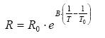 mit Ro = bekannter Widerstand bei Temperatur To, z.B. 25°C. B = Variable die sich in Abhängigkeit der Temperatur verändert; kann in bestimmten Temperatur-Bereichen als konstant angesehen werden. Im Datenblatt finden sich beispielsweise Werte für die Bereiche 25–50°C oder 25–85°C. Bei einem größeren Temperatur-Bereich, muss Formel 2 aus dem Datenblatt genutzt werden.