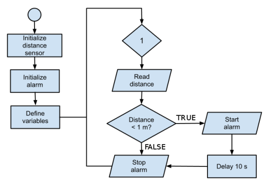 Flowcharts describing microcontroller software usually do not have ends, instead whole main activity in an endless cycle. The exit condition of the endless cycle will never be true and therefore this is the case where condition block (diamond) can be represented only on exiting arrow. Condition it self can be notes simply True or 1. Creating diagrams it is important to keep in eye on the fact that if the program has forks, it can be done only through the diamond object. Junctions (two arrows are joining) can be described by special symbol, but in simple cases, one may simply have an arrow point to another arrow instead.
